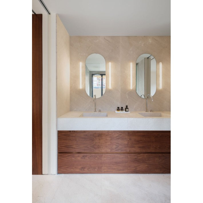 Luz de pared tallada en alabastro natural y fabricada a mano en Mallorca. Diseño tubular minimalista con tira LED integrada.