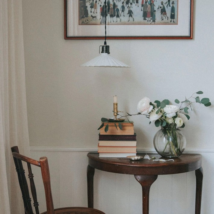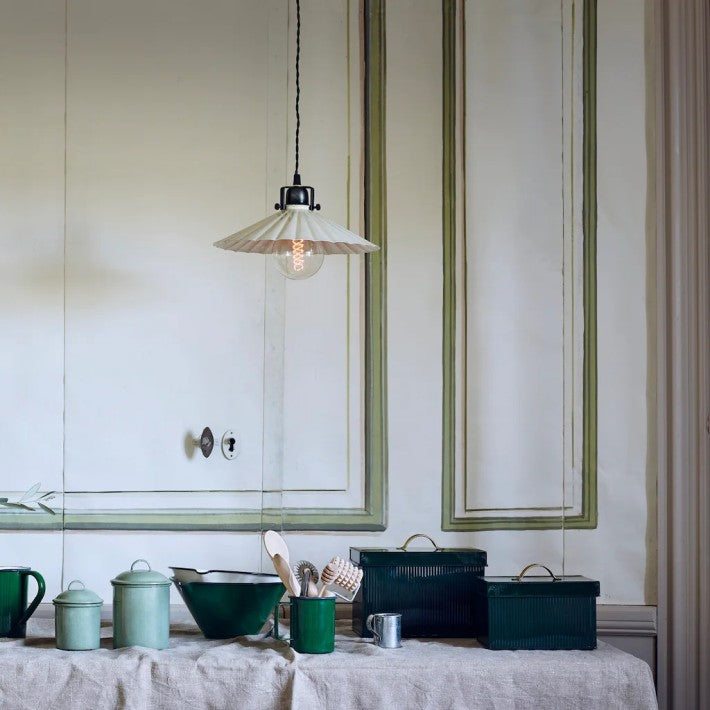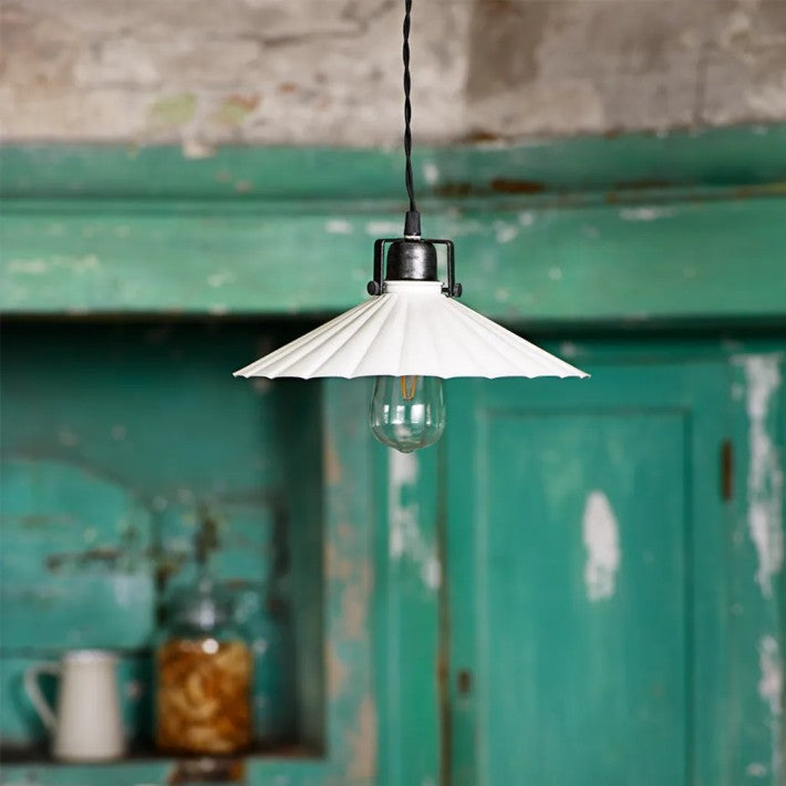 Pequeña lámpara colgante decorativa con pantalla en chapa lacada en blanco y soporte en gris grafito oscuro. Se puede colgar tanto sobre una ventana como sobre la mesa de la cocina. Cordón textil negro, longitud aprox. 150 cm. No hay interruptor en el cable o enchufe de la lámpara, elija si desea conectar un enchufe para la pared o el techo. Se adapta a E14, bombilla máxima de 25W no incluida.
