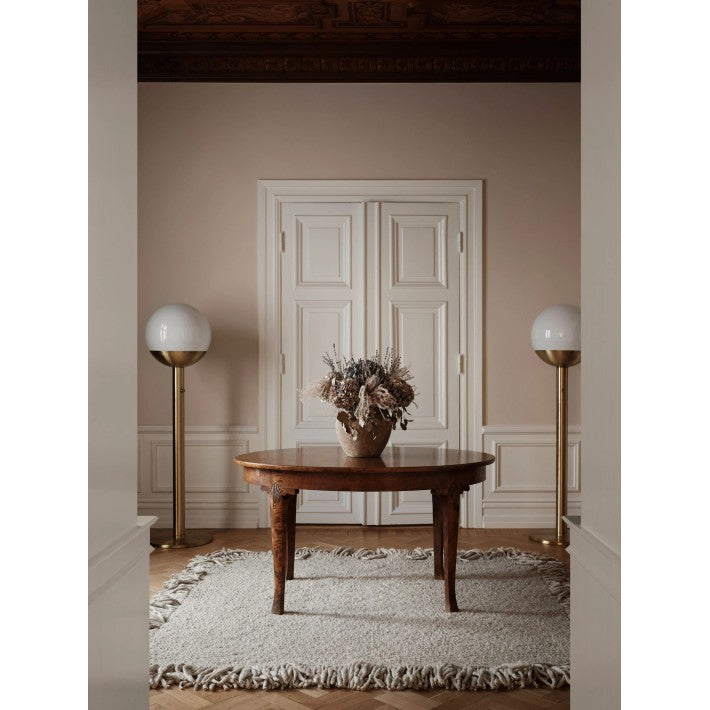 No.12 es una alfombra clásica pero tradicional en una lujosa lana gruesa tejida en una construcción de tejido de canasta. El hilo atrevido y exagerado recorre toda la alfombra y termina con flecos a lo largo de todos los lados con el mismo hilo.