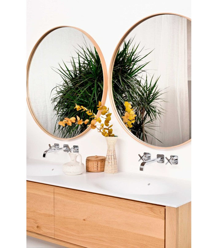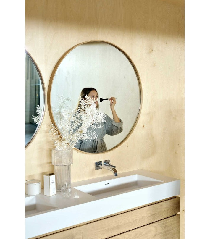 Bordes de roble y redondez perfecta: el espejo Layers se combinará y se destacará en cualquier entorno de baño.