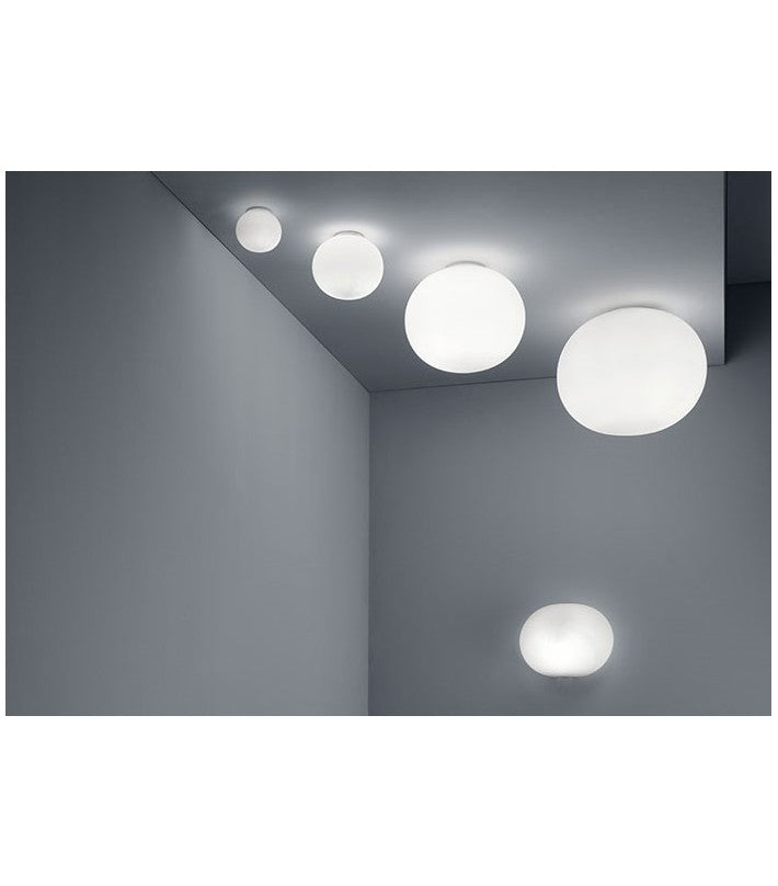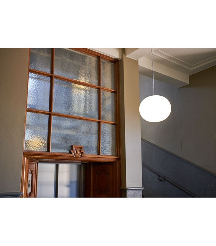 Lámpara de techo de luz difusa. Difusor formado por un cristal soplado opalino tratado al ácido.