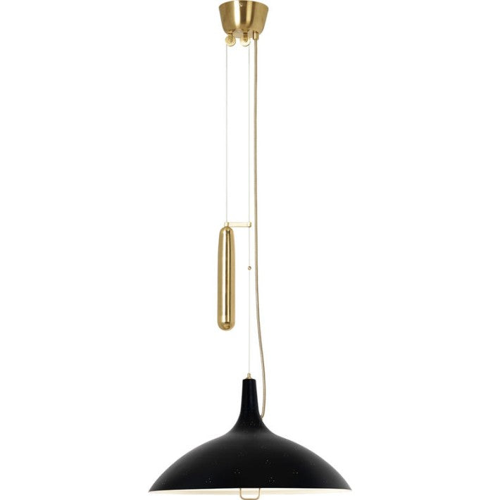 Tiene algunos de sus rasgos de diseño más distintivos: El material de latón perforado y pulido combinado con un mecanismo de elevación único, elevando y bajando la lámpara a diferentes alturas.