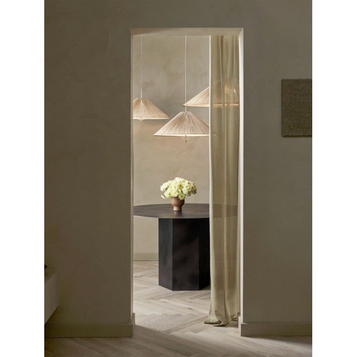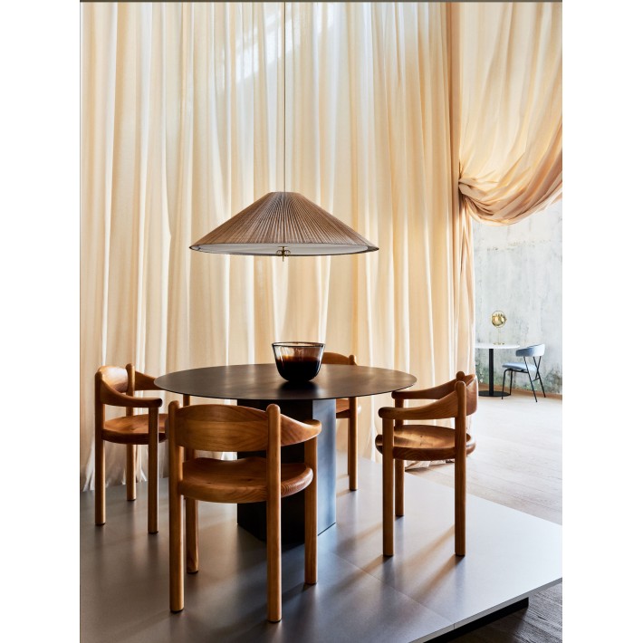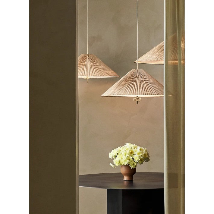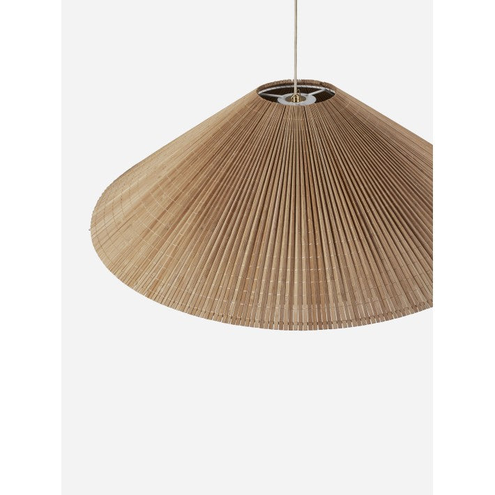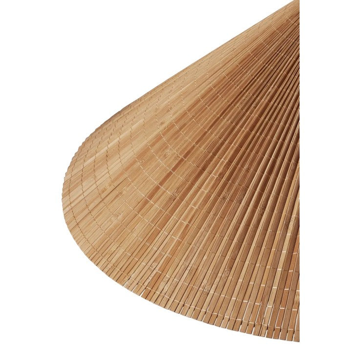 Diseñada por Paavo Tynell, la lámpara colgante de 1972 presenta una pantalla cónica de bambú, elaborada por artesanos expertos. Las láminas de bambú se cosen a mano para formar un tejido plisado que se fija manualmente al armazón de alambre, con un forro de lino en el medio.