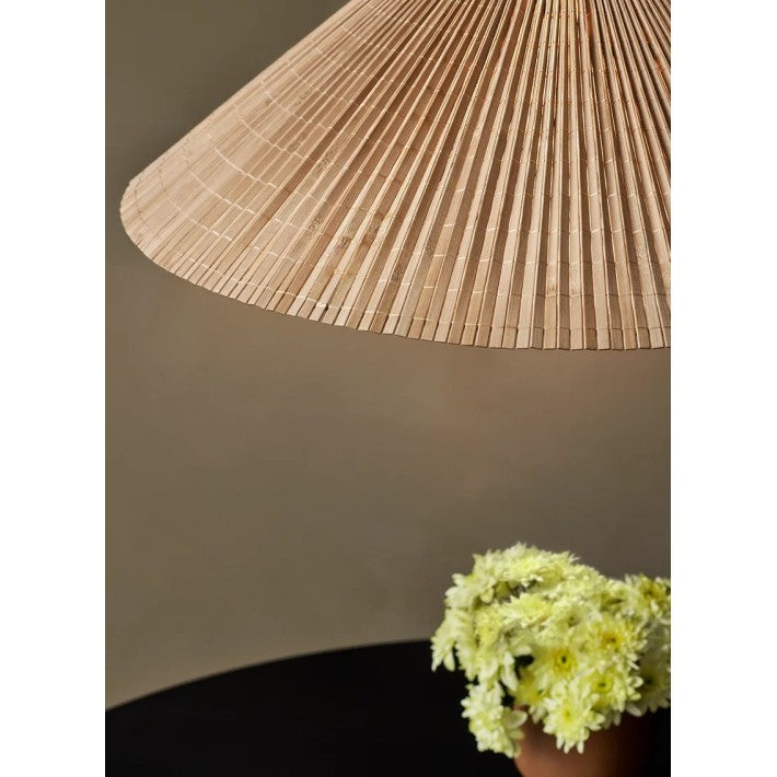 Esto dirige la luz hacia abajo hacia la base y crea un resplandor difuso alrededor de la pantalla y hacia arriba, ya que la luz penetra en las láminas de bambú.