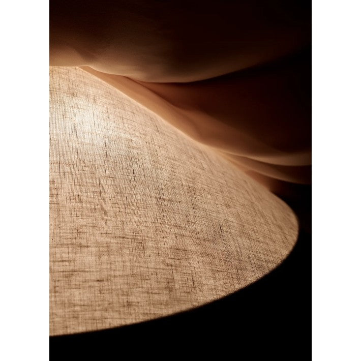 Debajo de la bombilla, un difusor de tela modula la luz y, debajo de este, un detalle decorativo de latón dota a cada lámpara de un toque de carácter e influye sutilmente en el juego de luces que genera.