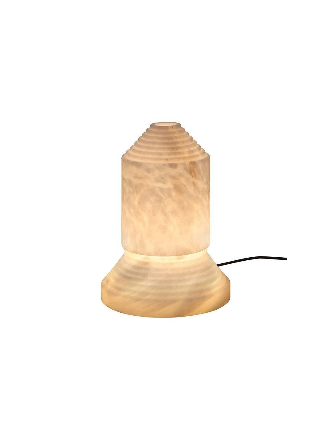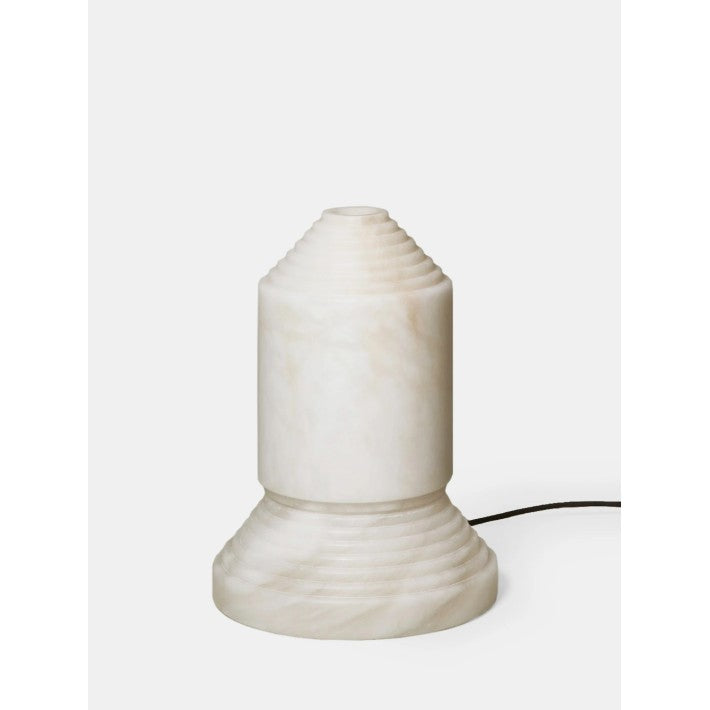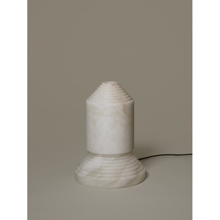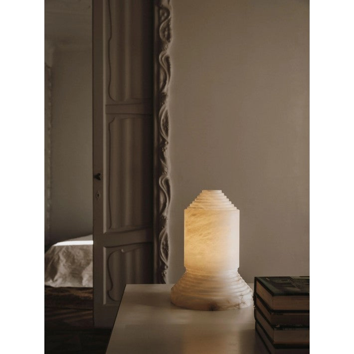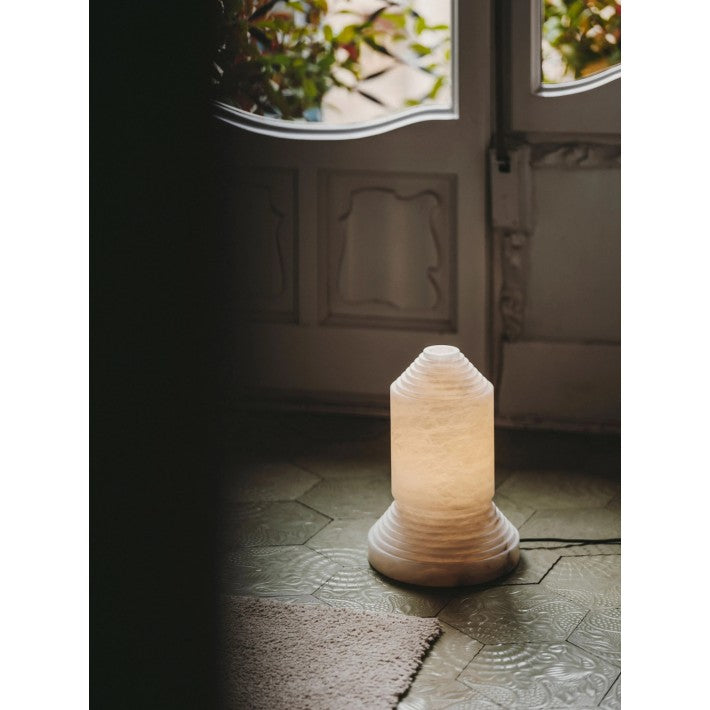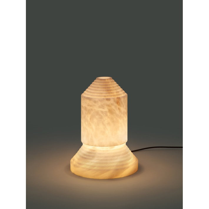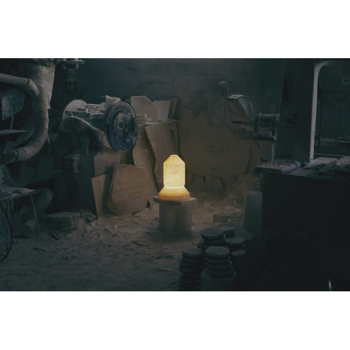Babel, cuyo nombre alude a la inacabada torre bíblica, se presenta como una escultura firme que es también una lámpara para la intimidad nocturna. El alabastro, macizo en la base y vaciado en la pantalla, sin que dos unidades puedan ser iguales, hace de ella una pieza de arte que nació como provocación contra al gusto dominante.