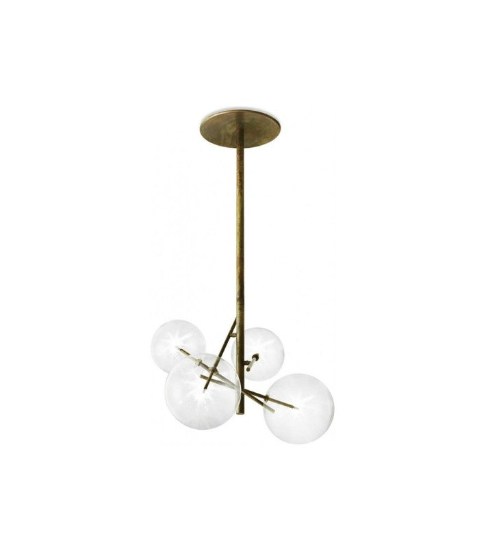 Lámpara de suspensión con 4 esferas de cristal soplado transparente. Piezas metálicas en latón pulido a mano. El latón está naturalmente manchado y desigual.
