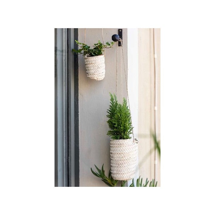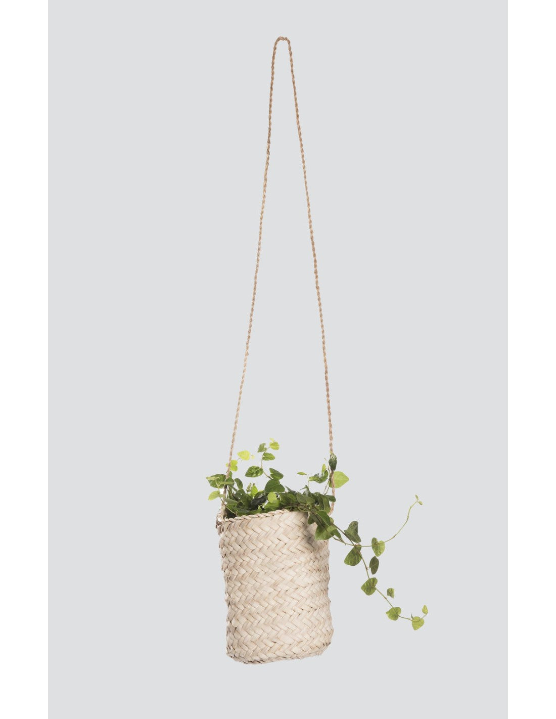 En esta cesta de hojas de palma para colgar, puedes poner una planta, así como una botella de vino o incluso flores. ¡Es multiusos!