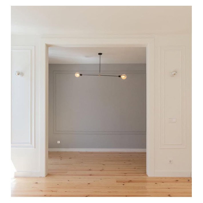 La lámpara de techo Nox combina porcelana esmaltada y metal en una composición visual equilibrada y llamativa. Sus dos brazos articulados permiten orientar la luz según las necesidades del espacio, creando una pieza tan versátil como decorativa.