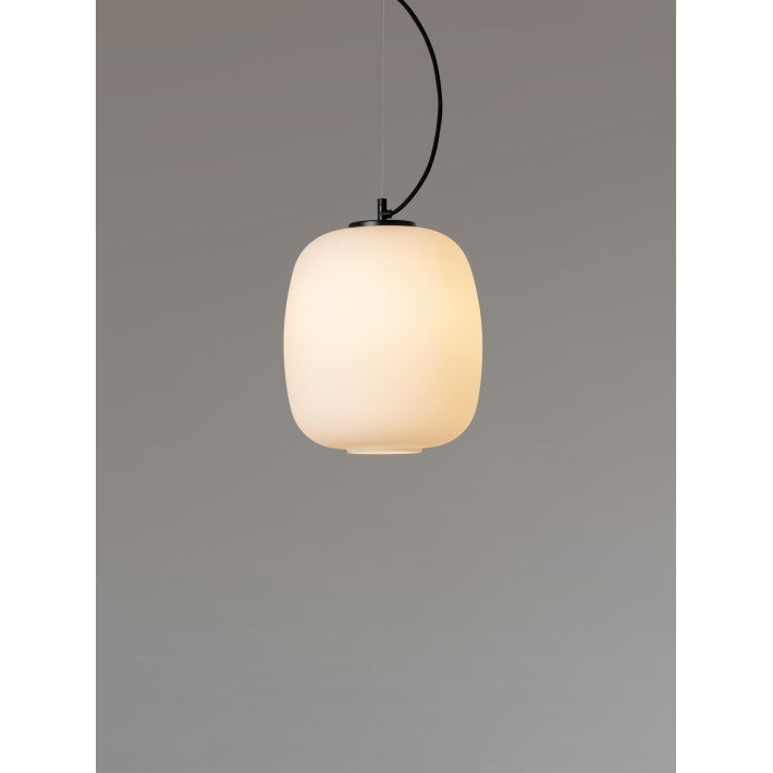 Pantalla de vidrio blanco opal. Florón circular metálico negro. Compatible para adaptador de salida lateral.