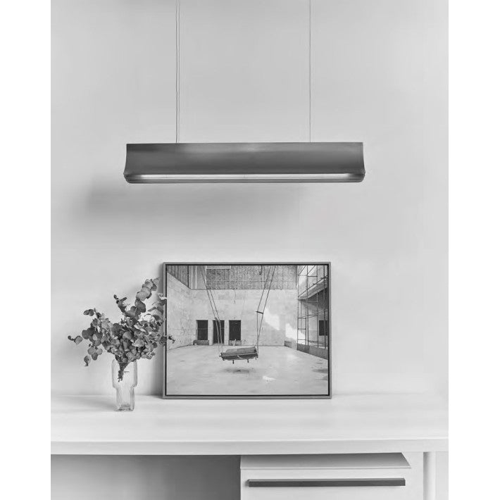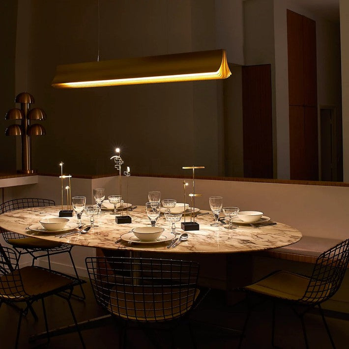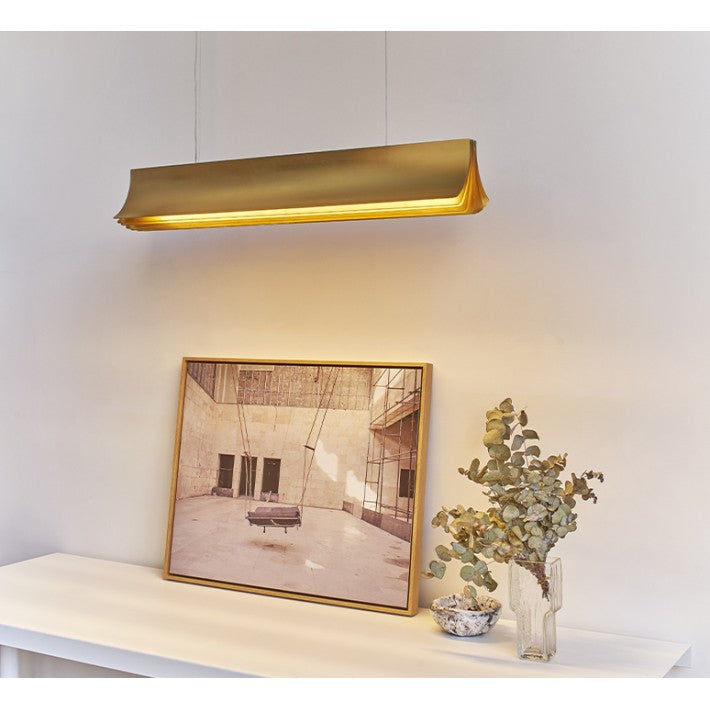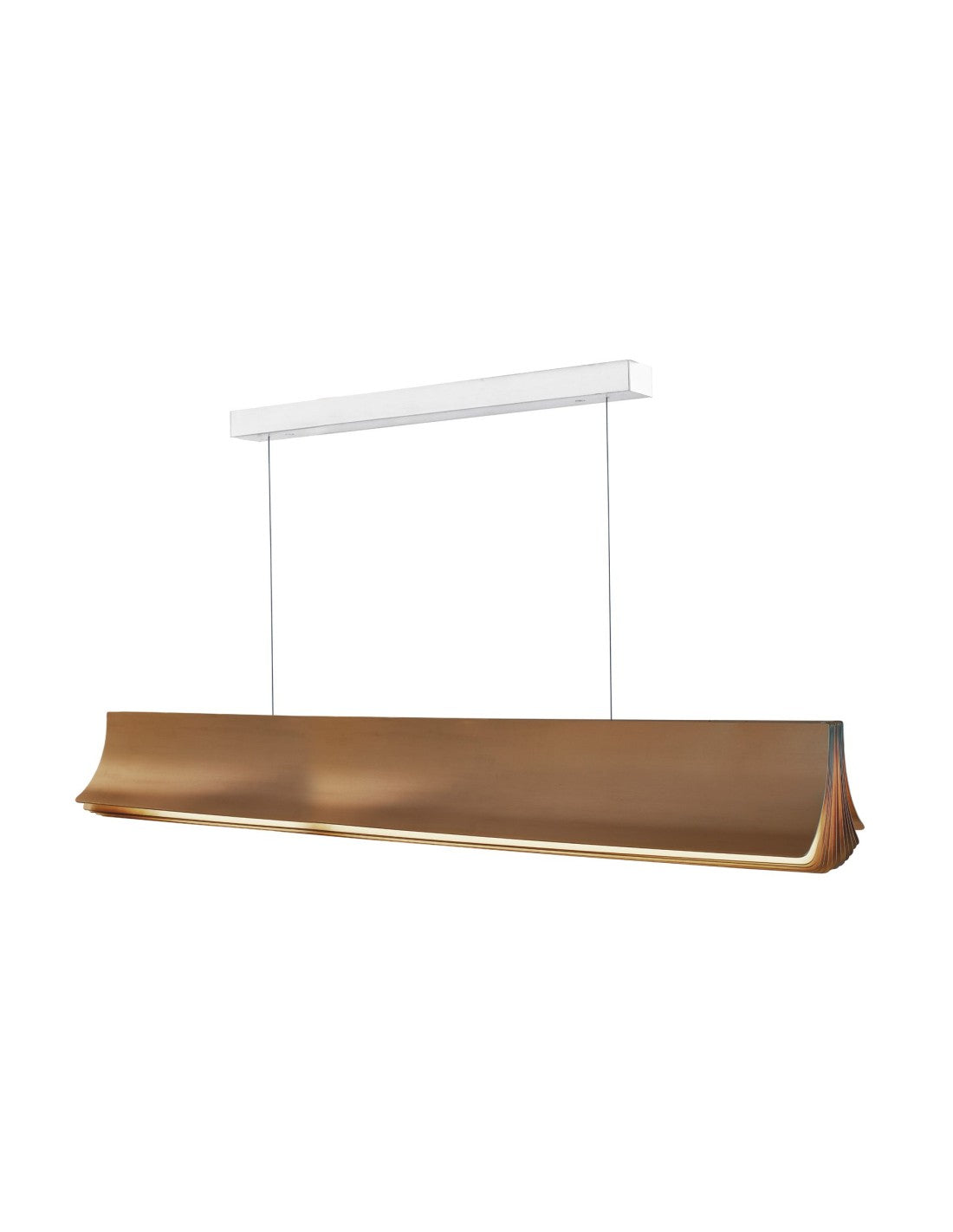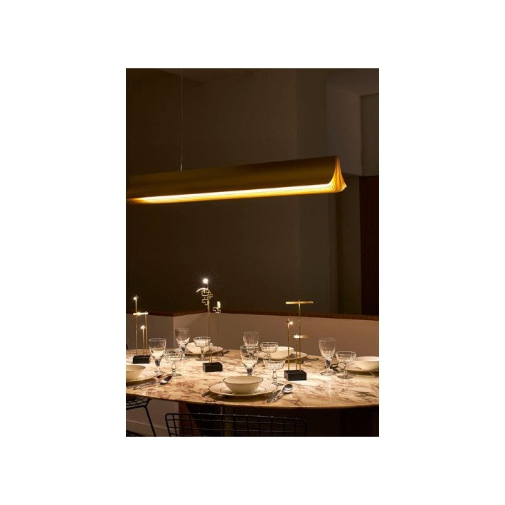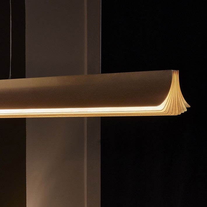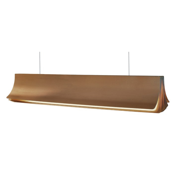 Fabricada en aluminio anodizado, esta suspensión de 120 cm de largo se asemeja a un libro abierto, con páginas doradas que irradian luz desde su módulo LED integrado. Combina diseño y eficiencia energética, ofreciendo tanto rendimiento como sostenibilidad.