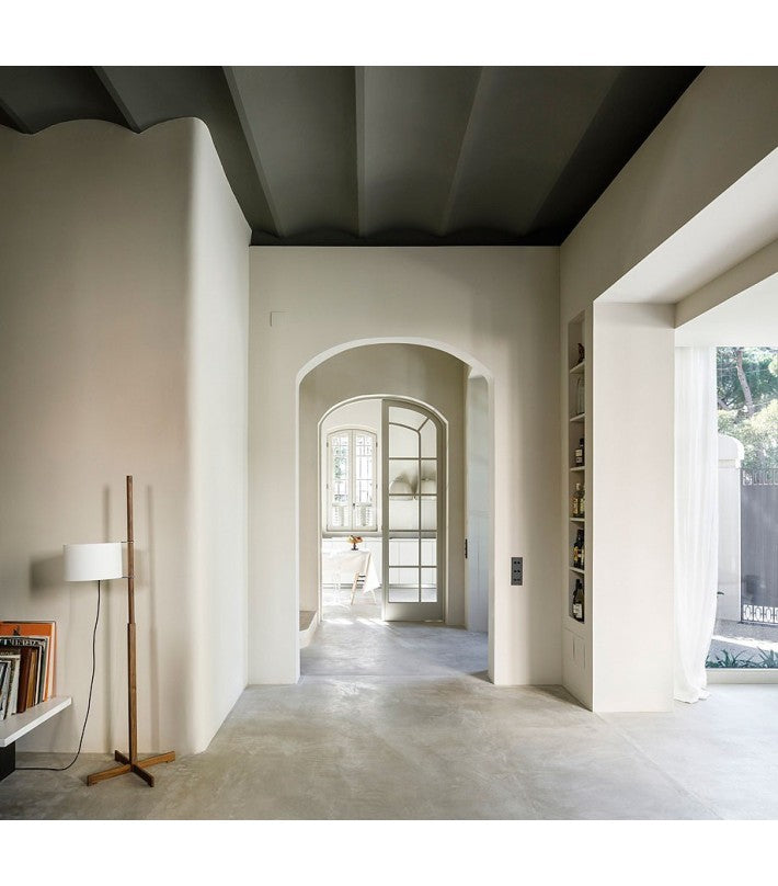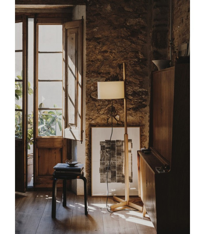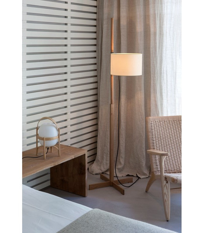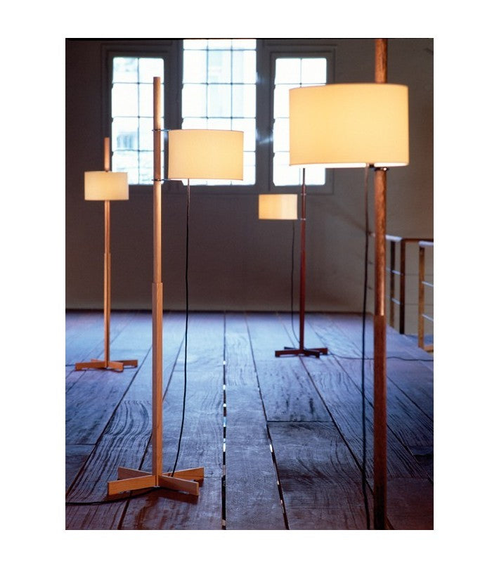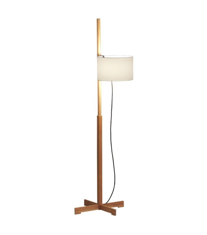 Posibilidad de elegir entre estructura en madera de cerezo, haya, roble o nogal; pantalla de cartulina (blanca o beige) regulable en altura, o blanca con difusor superior de polímero técnico traslúcido blanco.
