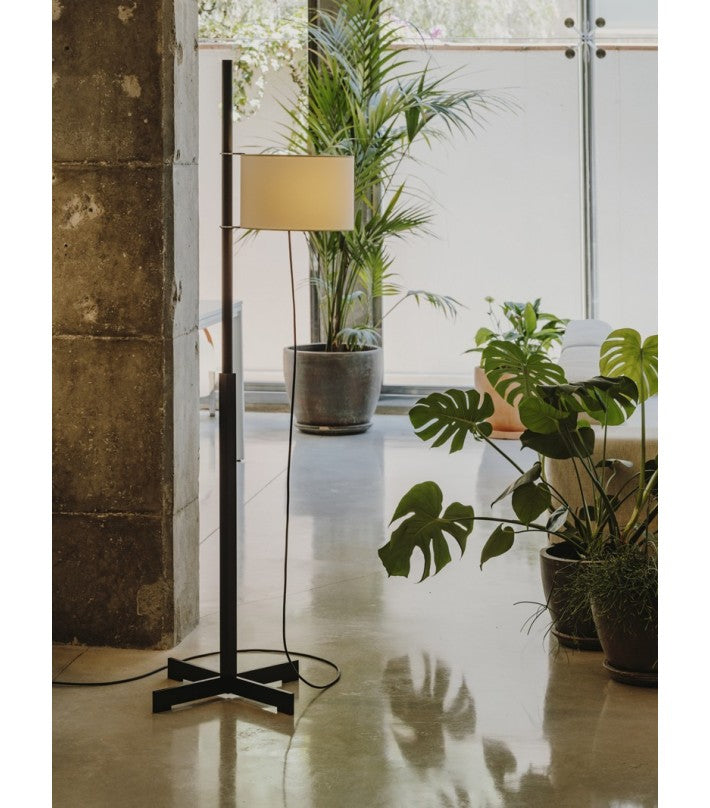 Una base en forma de cruz sostiene un fuste de sección cuadrada que muda a circular al llegar a su punto medio, para que se desplace sobre él la pantalla en forma de tambor.