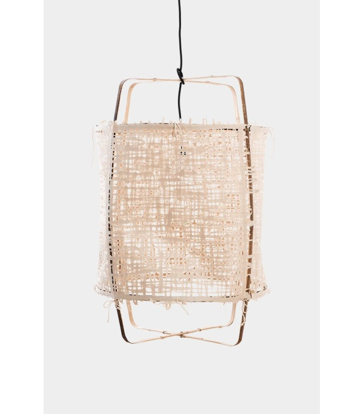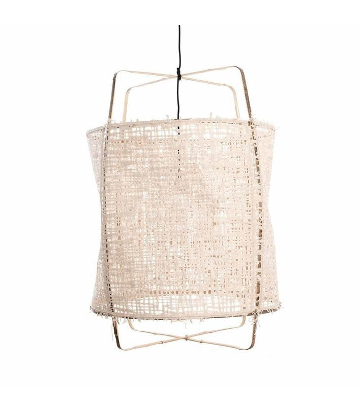 Material: Estructura de bambú; Revestida de papel color natural. Portalámparas de porcelana