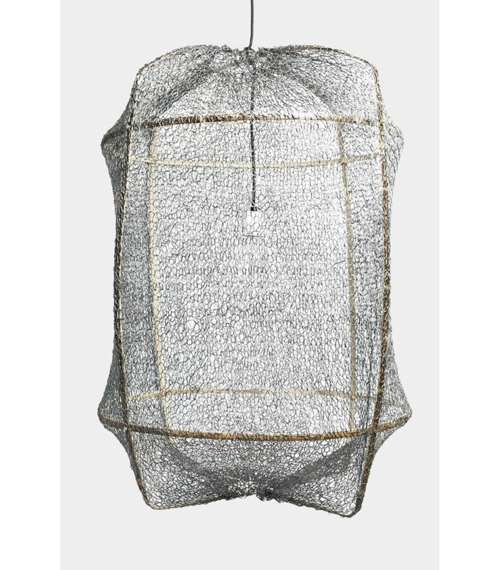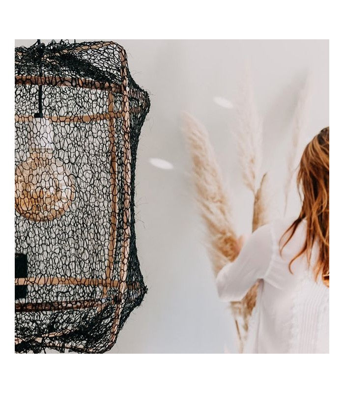 Material: Estructura de bambú; Revestida de red de sisal en color gris. Portalámparas de porcelana