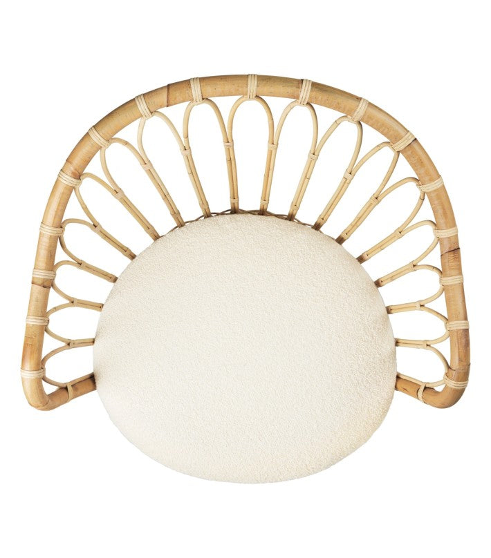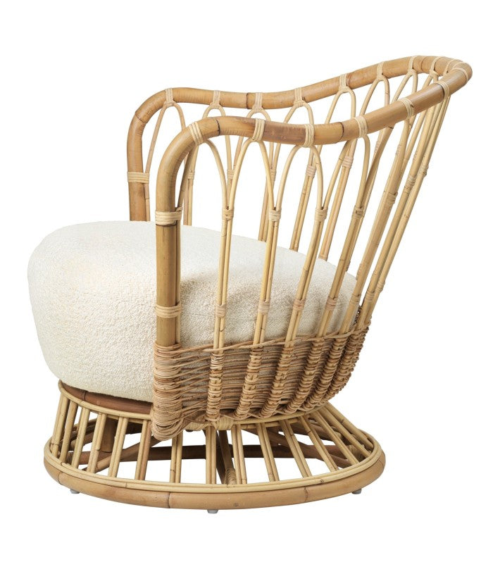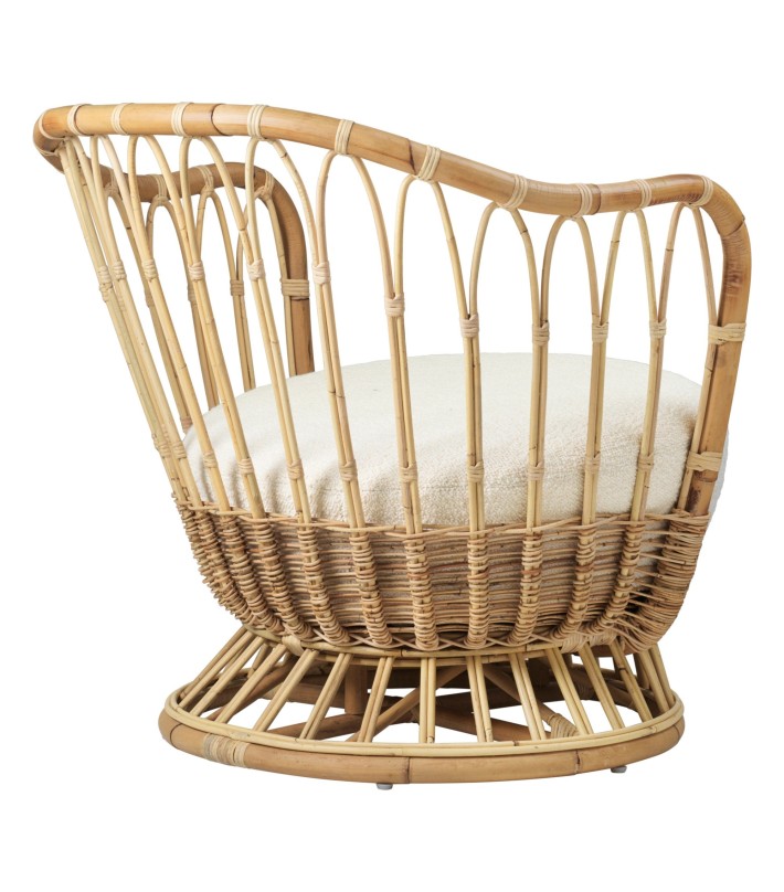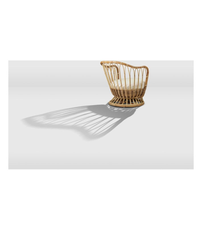 Inspirada por las suaves curvas de los guijarros y la madera flotante que coleccionaba de las playas del norte de Dinamarca, el arquitecto y diseñador Kindt-Larsen's imaginó un elegante refinamiento del sillón informal de ratán. Con sus curvas amplias y suaves y sus intrincados bucles de ratán flexible, sostiene un asiento tapizado generoso y envuelve un cojín de respaldo holgado y regordete. Juntos aportan una comodidad, tacto y ligereza que lleva el aire libre al interior, mientras que las características del marco de ratán le confieren una robustez y longevidad naturales.